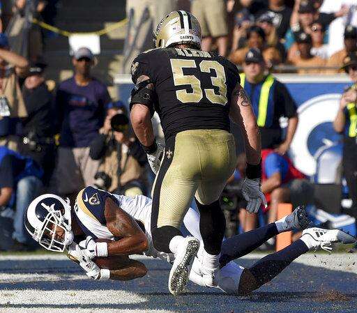 Los Angeles Rams wide receiver Josh Reynolds catches a touchdown pass as New Orleans Saints outside linebacker A.J. Klein looks on during the first half of an NFL football game Sunday, Nov. 26, 2017, in Los Angeles. (AP Photo/Mark J. Terrill) The Associated Press