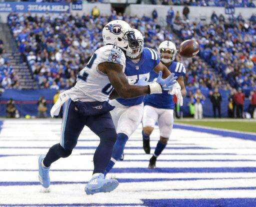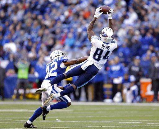 Tennessee Titans' Corey Davis (84) makes a catch against Indianapolis Colts' Kenny Moore (42) during the second half of an NFL football game, Sunday, Nov. 26, 2017, in Indianapolis. (AP Photo/AJ Mast) The Associated Press