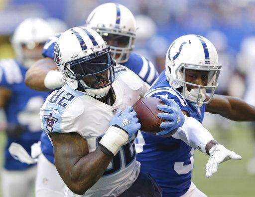 Tennessee Titans' Delanie Walker (82) makes a catch against Indianapolis Colts' Pierre Desir during the first half of an NFL football game, Sunday, Nov. 26, 2017, in Indianapolis. (AP Photo/AJ Mast) The Associated Press