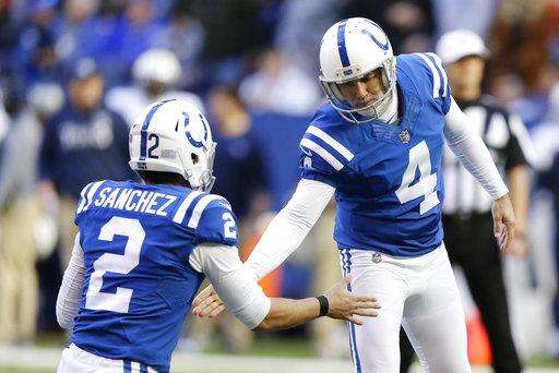 Indianapolis Colts kicker Adam Vinatieri (4) is congratulated by Rigoberto Sanchez after Vinatieri kicked a 28-yard field goal during the first half of an NFL football game against the Tennessee Titans, Sunday, Nov. 26, 2017, in Indianapolis. (AP Photo/Michael Conroy) The Associated Press