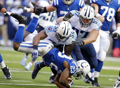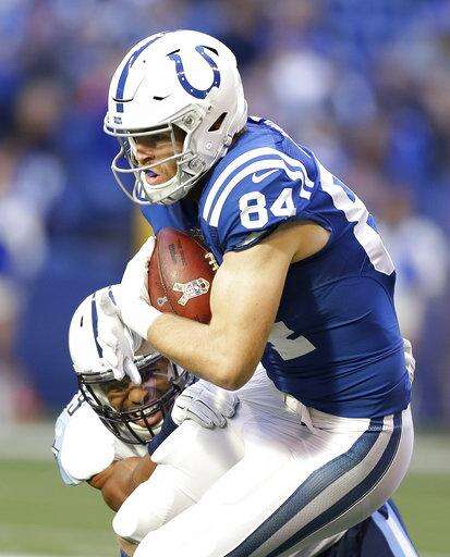 Indianapolis Colts' Jack Doyle (84) runs out of the tackle of Tennessee Titans' Wesley Woodyard during the first half of an NFL football game, Sunday, Nov. 26, 2017, in Indianapolis. (AP Photo/AJ Mast) The Associated Press