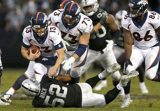 The Broncos trailed Oakland 21-0 at the time and Siemian led two touchdown drives to make a game of it. But he never got the chance to tie it up after Derek Carr completed a 54-yard pass just before the two-minute warning on third-and-8 with rookie Brendan Langley in coverage.