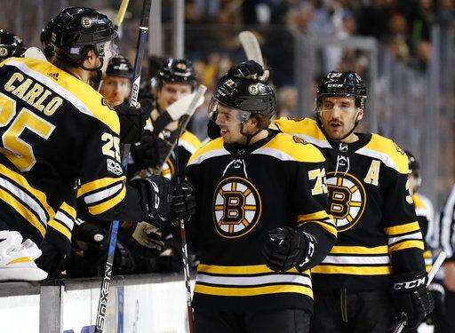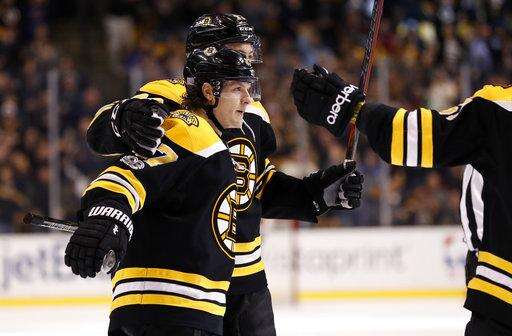 Boston Bruins' Charlie McAvoy is congratulated by Patrice Bergeron and Brandon Carlo (25) after his goal against the Tampa Bay Lightning during the first period of an NHL hockey game in Boston, Wednesday, Nov. 29, 2017. (AP Photo/Winslow Townson) The Associated Press