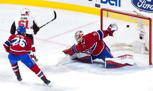 Ottawa Senators' Mark Stone scores a shorthanded goal past Montreal Canadiens goaltender Carey Price as defenseman Jeff Petry looks on during the first period of an NHL hockey game in Montreal on Wednesday, Nov. 29, 2017. (Paul Chiasson/The Canadian Press via AP) The Associated Press