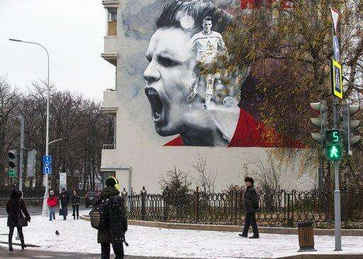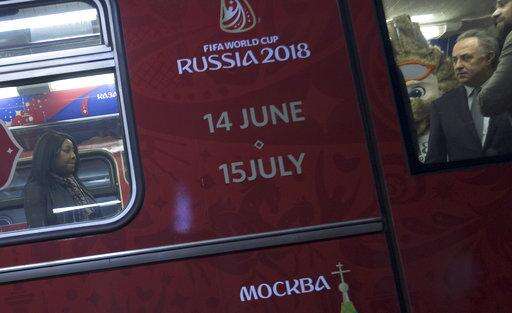 People walk past a huge poster promoting the upcoming soccer World Cup 2018 tournament in Moscow, Russia, Tuesday, Nov. 28, 2017. The World Cup will be played at 12 stadiums in 11 Russian cities. (AP Photo/Alexander Zemlianichenko) The Associated Press