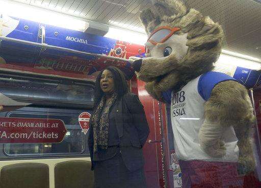 Fatma Samoura, FIFA Secretary General, left, speaks to the media with a mascot of the 2018 World Cup, the wolf named Zabivaka, seen at right, in the metro train branded for the 2018 World Cup during a ceremony in Moscow, Russia, on Tuesday, Nov. 28, 2017. (AP Photo/Ivan Sekretarev) The Associated Press