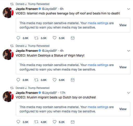 This screenshot from President Donald Trump's Twitter account shows three retweets that he posted early Wednesday morning, Nov. 29, 2017, from the account of Jayda Fransen, the deputy leader of the British far-right fringe group Britain First. The origins of the videos in the tweets could not immediately be determined. They purport to show violence being committed by Muslims. (Twitter via AP) The Associated Press