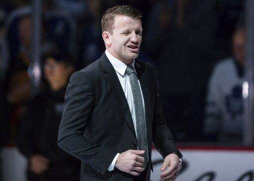 Former Vancouver Canuck Derek Dorsett, whose hockey career recently ended due to medical reasons, winks at goalie Jacob Markstrom as he leaves the ice after helping honor Daniel Sedin, of Sweden, for recently recording his 1,000th career point, before the Canucks' NHL hockey game against the Toronto Maple Leafs on Saturday, Dec. 2, 2017, in Vancouver, British Columbia. (Darryl Dyck/The Canadian Press via AP The Associated Press
