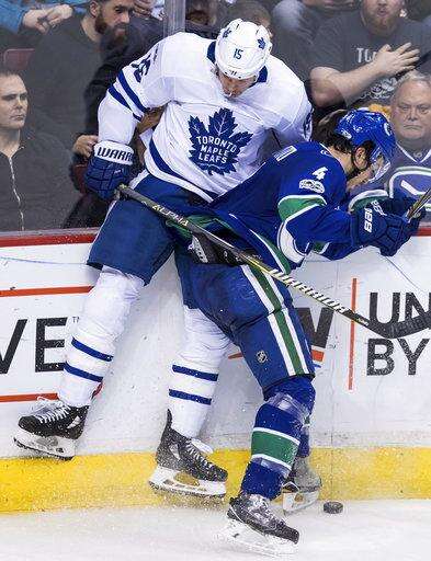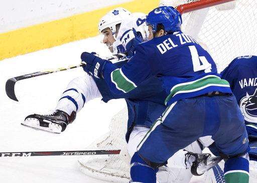 Vancouver Canucks' Michael Del Zotto (4) checks Toronto Maple Leafs' Nazem Kadri during the second period of an NHL hockey game Saturday, Dec. 2, 2017, in Vancouver, British Columbia. (Darryl Dyck/The Canadian Press via AP) The Associated Press