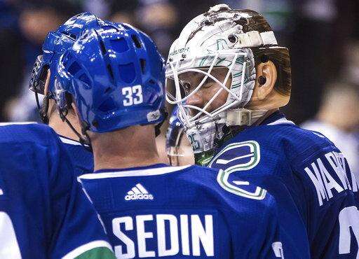 Vancouver Canucks goalie Jacob Markstrom, right, and teammate Henrik Sedin, both of Sweden, celebrate after the Canucks defeated the Toronto Maple Leafs 2-1 in an NHL hockey game Saturday, Dec. 2, 2017, in Vancouver, British Columbia. (Darryl Dyck/The Canadian Press via AP) The Associated Press