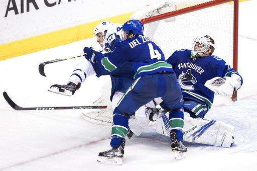Vancouver Canucks goalie Jacob Markstrom, of Sweden, falls to the ice after Michael Del Zotto checked Toronto Maple Leafs' Nazem Kadri into him during the second period of an NHL hockey game Saturday, Dec. 2, 2017, in Vancouver, British Columbia. (Darryl Dyck/The Canadian Press via AP) The Associated Press