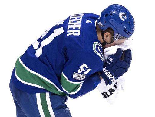 Vancouver Canucks' Troy Stecher holds a towel to his face as he skates off the ice after being struck by the puck during the second period of an NHL hockey game against the Toronto Maple Leafs on Saturday, Dec. 2, 2017, in Vancouver, British Columbia. (Darryl Dyck/The Canadian Press via AP) The Associated Press