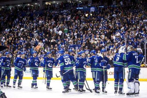 Vancouver Canucks players line up to congratulate goalie Jacob Markstrom, right, of Sweden, after the team's 2-1 win over the Toronto Maple Leafs during an NHL hockey game Saturday, Dec. 2, 2017, in Vancouver, British Columbia. (Darryl Dyck/The Canadian Press via AP) The Associated Press