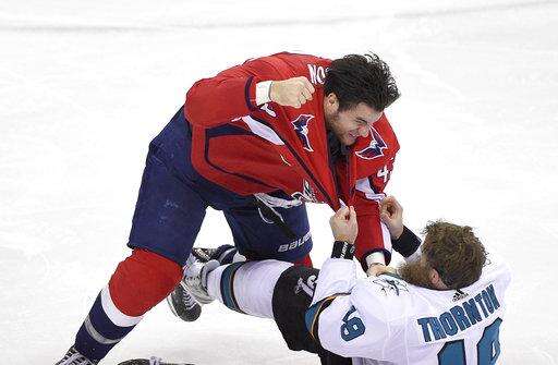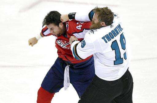 San Jose Sharks center Joe Thornton (19) fights Washington Capitals right wing Tom Wilson (43) during the third period of an NHL hockey game, Monday, Dec. 4, 2017, in Washington. (AP Photo/Nick Wass) The Associated Press