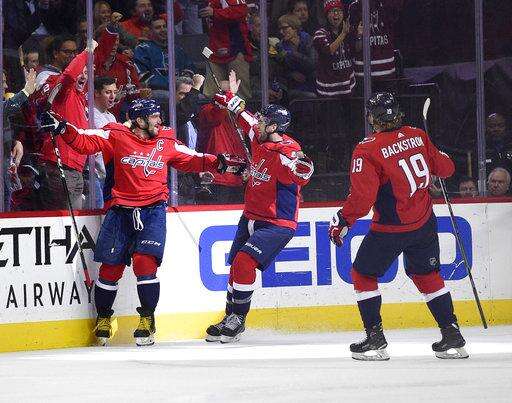 Washington Capitals left wing Alex Ovechkin (8), of Russia, left, celebrates his goal with Tom Wilson, center, and Nicklas Backstrom (19), of Sweden, during the second period of an NHL hockey game against the San Jose Sharks, Monday, Dec. 4, 2017, in Washington. (AP Photo/Nick Wass) The Associated Press