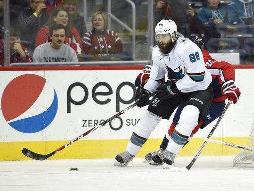 San Jose Sharks defenseman Brent Burns (88) skates with the puck against Washington Capitals right wing Devante Smith-Pelly, back, during the first period of an NHL hockey game, Monday, Dec. 4, 2017, in Washington. (AP Photo/Nick Wass) The Associated Press