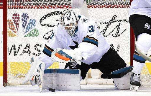 San Jose Sharks goalie Martin Jones (31) stops the puck during the first period of an NHL hockey game against the Washington Capitals, Monday, Dec. 4, 2017, in Washington. (AP Photo/Nick Wass) The Associated Press