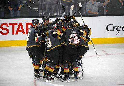 Vegas Golden Knights celebrate after defeating the Anaheim Ducks in a shootout in an NHL hockey game Tuesday, Dec. 5, 2017, in Las Vegas. The Knights won 4-3. (AP Photo/John Locher) The Associated Press