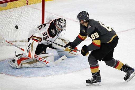 Vegas Golden Knights right wing Alex Tuch scores the only goal of the shootout, against Anaheim Ducks goalie John Gibson in an NHL hockey game Tuesday, Dec. 5, 2017, in Las Vegas. The Knights won 4-3. (AP Photo/John Locher) The Associated Press