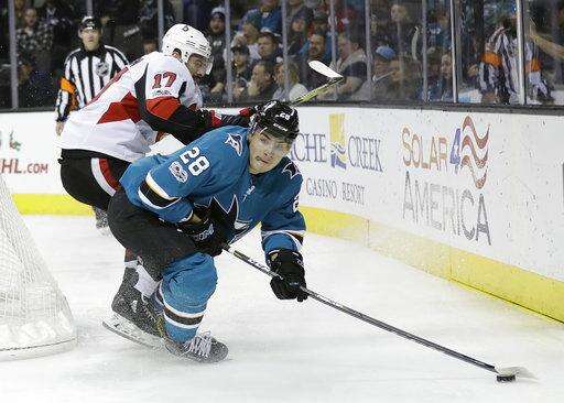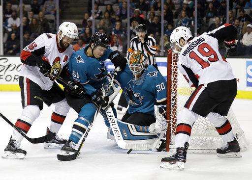 NOTES: Ottawa's Ryan Dzingel fought Marcus Sorensen early in the third period. Alexandre Burrows was given a fighting major and game misconduct later in the period after going at Dylan DeMelo with a stick to the face. ... Sharks D Paul Martin (ankle) was sent to the AHL on a conditioning assignment. Martin played Thursday in his first game since Oct. 7.