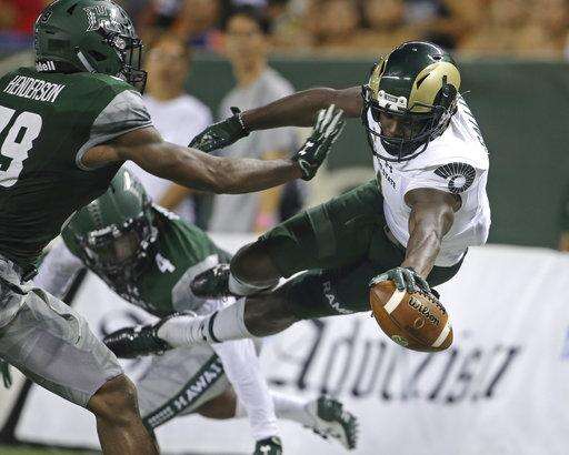 FILE - This Sept. 30, 2017, file photo shows Hawaii defensive backs Trayvon Henderson (39) and Daniel Lewis Jr. (4), defending Colorado State wide receiver Michael Gallup (4) who tries to leap into the end zone during the second quarter of the NCAA college football in Honolulu. Colorado State and Marshall, two programs that started strong only to end finish slow this season, are meeting in the New Mexico Bowl to help kick off the college postseason. (AP Photo/Marco Garcia, File) The Associated Press
