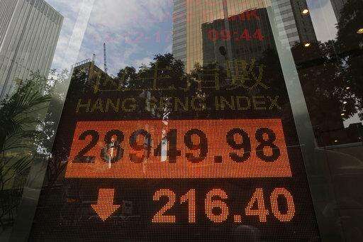 WALL STREET: Japan's benchmark Nikkei 225 index dipped 0.6 percent to close at 22,553.22 but South Korea's Kospi climbed 0.5 percent to 2,482.07. Hong Kong's Hang Seng shed 1.1 percent to 28,848.11 and the Shanghai Composite index lost 0.8 percent to 3,266.14. Australia's S&P/ASX 200 sank 0.2 percent to 5,997.00. Indexes in Taiwan and Southeast Asia declined.