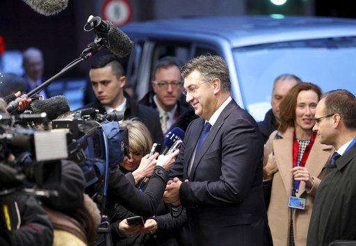 Croatian Prime Minister Andrej Plenkovic, center, speaks with journalists as he arrives for an EU summit at the EU Council building in Brussels on Friday, Dec. 15, 2017. European union leaders meet Friday to launch Brexit talks into a new phase and to discuss the euro and banking union. (AP Photo/Olivier Matthys)