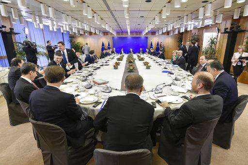 European Union heads of state attend a breakfast meeting at an EU summit in Brussels on Friday, Dec. 15, 2017. European Union leaders were set Friday to authorize a new phase in Brexit talks as time runs short to clinch an agreement on future relations and trade with Britain before it leaves the bloc in March 2019. (John Thys, Pool Photo via AP)