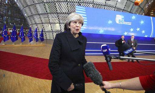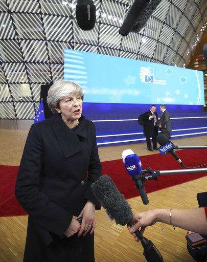 British Prime Minister Theresa May speaks with the media as she arrives for an EU summit at the Europa building in Brussels on Thursday, Dec. 14, 2017. European Union leaders are gathering in Brussels and are set to move Brexit talks into a new phase as pressure mounts on Prime Minister Theresa May over her plans to take Britain out of the 28-nation bloc. (AP Photo/Olivier Matthys)