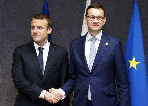 French President Emmanuel Macron, left, shakes hands with Polish Prime Minister Mateusz Morawiecki prior to a meeting on the sidelines of an EU summit in Brussels on Friday, Dec. 15, 2017. EU leaders meet Friday to launch Brexit talks into a new phase and to discuss the euro and banking union. (Francois Lenoir, Pool Photo via AP)