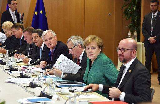 EU leaders attend a round table meeting regarding Article 50 at an EU summit in Brussels on Friday, Dec. 15, 2017. From left, Lithuanian President Dalia Grybauskaite, Romanian President Klaus Werner Ioannis, Danish Prime Minister Lars Lokke Rasmussen, Cypriot President Nicos Anastasiades, Chief Brexit Negotiator Michel Barnier, European Commission President Jean-Claude Juncker, German Chancellor Angela Merkel and Belgian Prime Minister Charles Michel. (AP Photo/Geert Vanden Wijngaert)