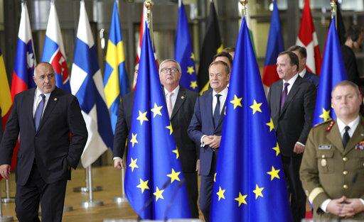 European Council President Donald Tusk, center right, and European Commission President Jean-Claude Juncker, center left, arrive for a group photo at an EU summit at the Europa building in Brussels on Thursday, Dec. 14, 2017. European Union leaders are gathering in Brussels and are set to move Brexit talks into a new phase as pressure mounts on Prime Minister Theresa May over her plans to take Britain out of the 28-nation bloc. (AP Photo/Olivier Matthys)