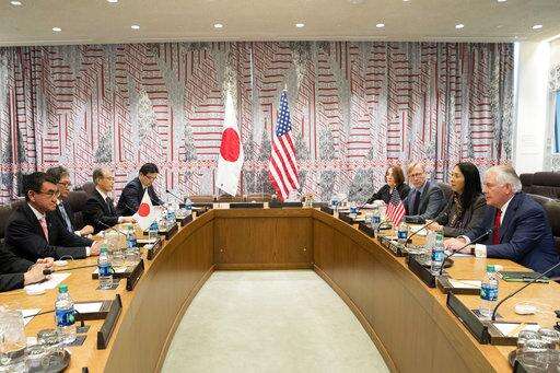 Japanese Foreign Minister Taro Kono, left, meets American Secretary of State Rex Tillerson before a high level Security Council meeting on North Korea, Friday, Dec. 15, 2017, at United Nations headquarters. (AP Photo/Mary Altaffer) The Associated Press
