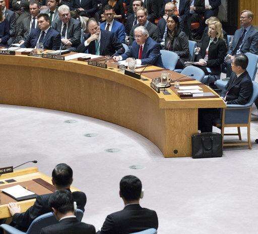 Tillerson called on China and Russia to go beyond U.N.-mandated economic sanctions imposed on North Korea over its nuclear and missile tests. He said North Korean laborers were toiling in "slave-like conditions" in Russia for wages used to fund nuclear weapons, while China was still allowing crude oil to flow into North Korean refineries.