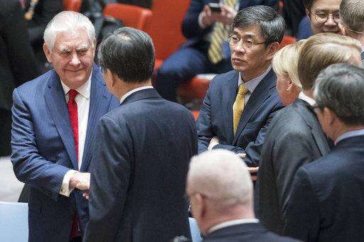 American Secretary of State Rex Tillerson, left, greets South Korean Vice Minister of Foreign Affairs Cho Hyun before the start of a high level Security Council meeting on the situation in North Korea, Friday, Dec. 15, 2017 at United Nations headquarters. (AP Photo/Mary Altaffer) The Associated Press