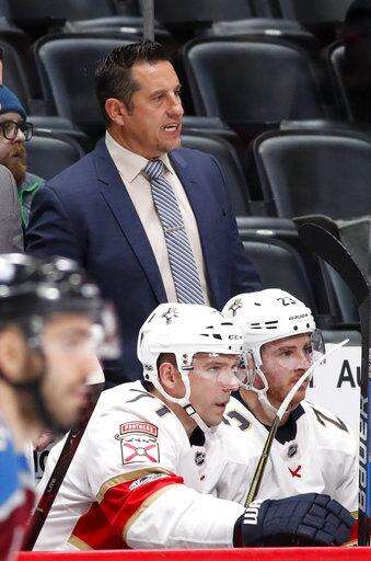 Florida Panthers head coach Bob Boughner, top, directs his team against the Colorado Avalanche in the second period of an NHL hockey game Thursday, Dec. 14, 2017, in Denver. (AP Photo/David Zalubowski) The Associated Press