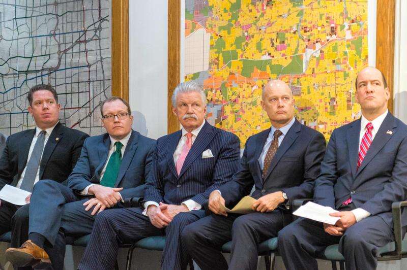 State's attorneys representing about 3 million suburban residents filed individual lawsuits Thursday seeking compensation for expenses incurred battling the opioid death epidemic. From left, Lake County's Mike Nerheim, McHenry County's Pat Kenneally, Will County's James Glasgow, Kane County's Joe McMahon and DuPage County's Bob Berlin said the lawsuit, if successful, will result in fewer overdose deaths. James Fuller/jfuller@dailyherald.com