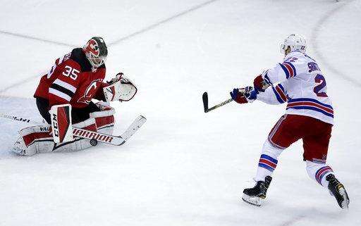 New Jersey Devils goalie Cory Schneider, left, stops a shootout shot by New York Rangers defenseman Kevin Shattenkirk in an NHL hockey game Thursday, Dec. 21, 2017, in Newark, N.J. The Devils won 4-3. (AP Photo/Julio Cortez) The Associated Press