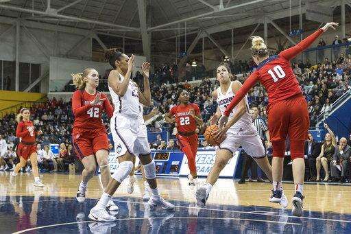 The game was a homecoming of sorts for Nurse. The senior forward from Hamilton, Ontario, received a rousing ovation from the sellout crowd when she was introduced as UConn's final starter, and another when she checked out with 3:24 remaining and her team leading 98-50. Nurse finished with five rebounds and two assists. She was 9 for 11 from the field.