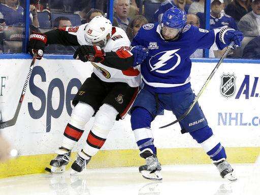 NOTES: Kucherov has scored multiple points in four consecutive games and a league-best 18 overall. ... D Victor Hedman has produced points in five consecutive games for Tampa Bay. ... Senators D Dion Phaneuf missed his first game this season for personal reasons. Other Ottawa scratches were D Andreas Englund, recalled earlier in the day from the AHL, and C Filip Chlapik. ... D Slater Koekkoek and Andrej Sustr were healthy scratches for the Lightning.