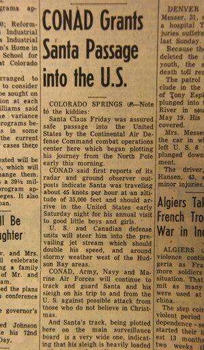 "Note to the kiddies," the story began, under a Colorado Springs dateline. "Santa Claus Friday was assured safe passage into the United States by the Continental Air Defense Command combat operations center here which began plotting his journey from the North Pole early this morning."