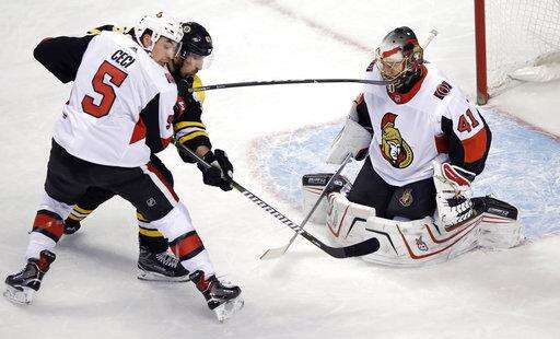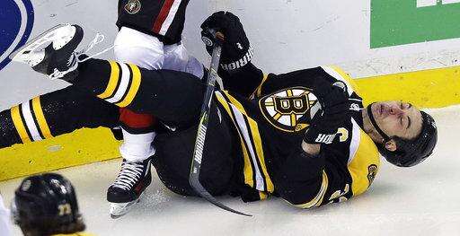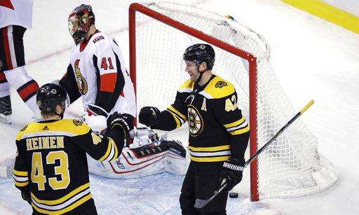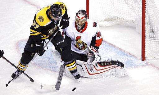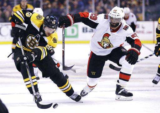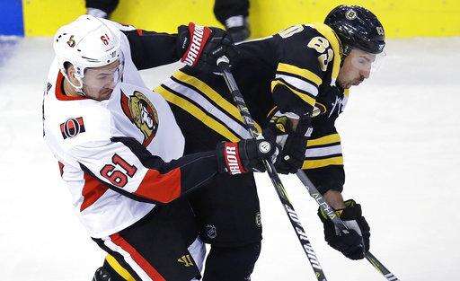 NOTES: Miller's last goal came on April 2 at Chicago. ... Ottawa entered with eight overtime losses, tied for most in the NHL. ... The Senators recalled D Ben Harpur from Belleville of the AHL, but he was a healthy scratch. ... Bruins forward Tim Schaller decidedly won a fight against Claesson after the illegal hit on Acciari. ... Former Bruins star and coach Terry O'Reilly was in a luxury box and shown on the video board. ... Boston forward Brad Marchand's next assist will be the 200th of his career. . Boston coach Bruce Cassidy joked about some of his young players having a solid game by saying: "Yeah, like a lot of nights, two or three really had their legs and two or three looked like they had some extra Christmas turkey." . A fire alarm was going off during most of Cassidy's postgame news conference.