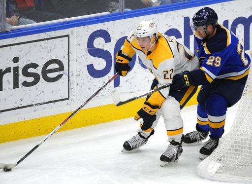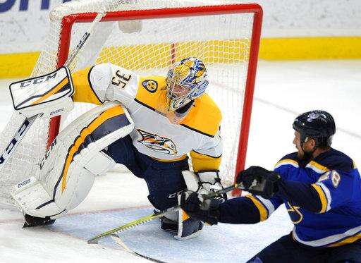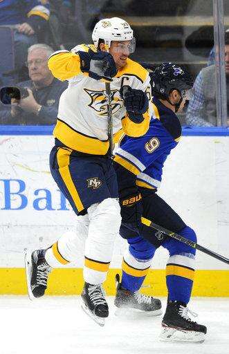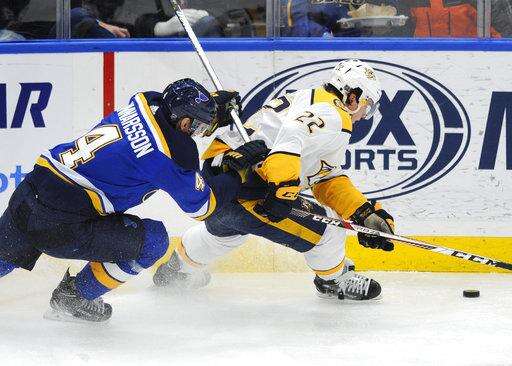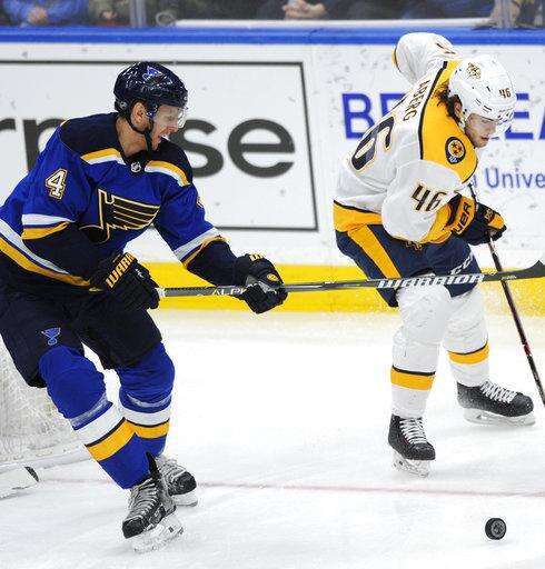 NOTES: The Blues announced a four-year contract extension for GM Doug Armstrong with a club option for a fifth year. ... Predators GM David Poile believes D Ryan Ellis (knee surgery) will play his first game of the season within the next two weeks. ... The Blues scratched RW Chris Thorburn, D Jordan Schmaltz and C Ivan Barbashev. ... The Predators scratched D Anthony Bitetto, RW Miikka Salomaki and LW Cody McLeod.