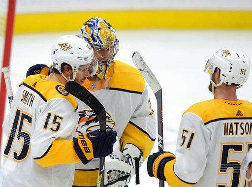 Nashville Predators goalie Pikka Rinne, left, of Finland, is congratulated by Austin Watson (51) after their victory over the St. Louis Blues in an NHL hockey game, Wednesday, Dec. 27, 2017, in St. Louis. (AP Photo/Bill Boyce) The Associated Press
