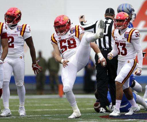 Iowa State defensive end J.D. Waggoner (58) celebrates after making a stop against Memphis in the first half of the Liberty Bowl NCAA college football game Saturday, Dec. 30, 2017, in Memphis, Tenn. (AP Photo/Mark Humphrey) The Associated Press