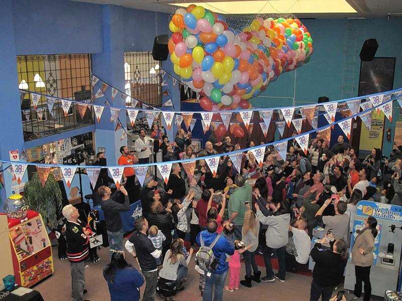 In Aurora, the DJ's countdown to noon ended with a cascade of balloons, some of which hid candy or raffle tickets, making them carriers of valuable loot. Little ones stomped, sat on and even rolled over the rubbery orbs to get them to pop, creating an echo chamber of excitement.