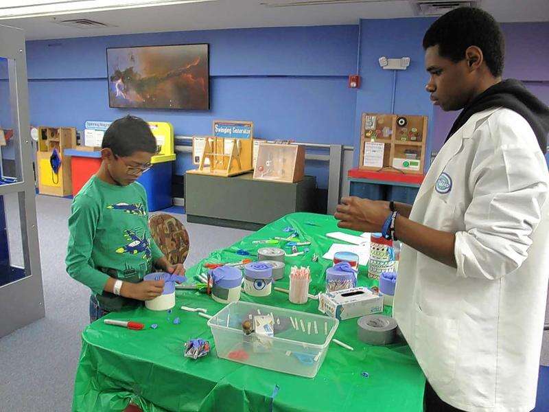 Attending with his parents from West Bend, Wisconsin, 9-year-old Dimanth Thaduri became one of Nehemiah Clanton's students as the duo made a noisemaker out of a piece of PVC piping, a rubber glove, duct tape and a straw.