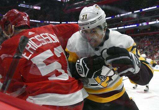 Dylan Larkin and Frans Nielsen also scored for Detroit. Evgeni Malkin got his fifth goal in seven games for the Penguins.