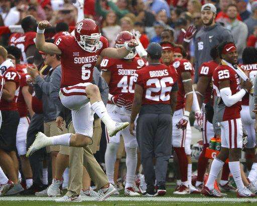 In the final game of his great career, Oklahoma's Baker Mayfield threw for 287 yards and two touchdowns, and caught a touchdown pass that gave the Sooners a 17-point lead with 6 seconds left in the first half.