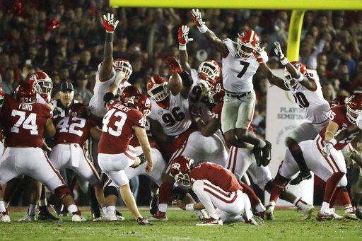 After an offside penalty on Georgia gave Oklahoma a first down on third-and-five in the second OT possession, the Sooners stalled again and Austin Seibert came out for a 27-yard field goal. Leaping through the line, Lorenzo Carter got his outstretched hand on the kick and the ball fluttered down short of the uprights.